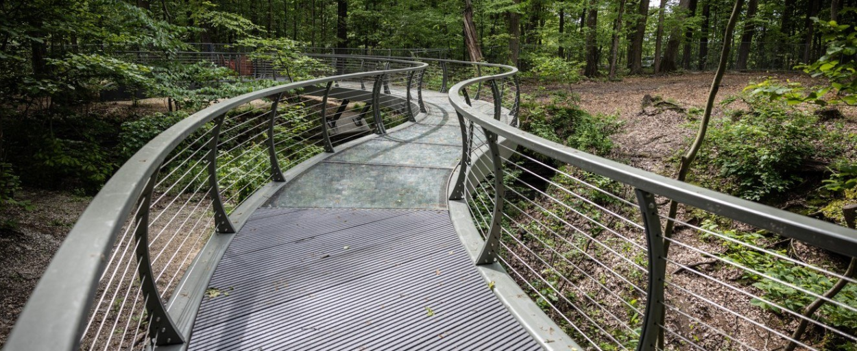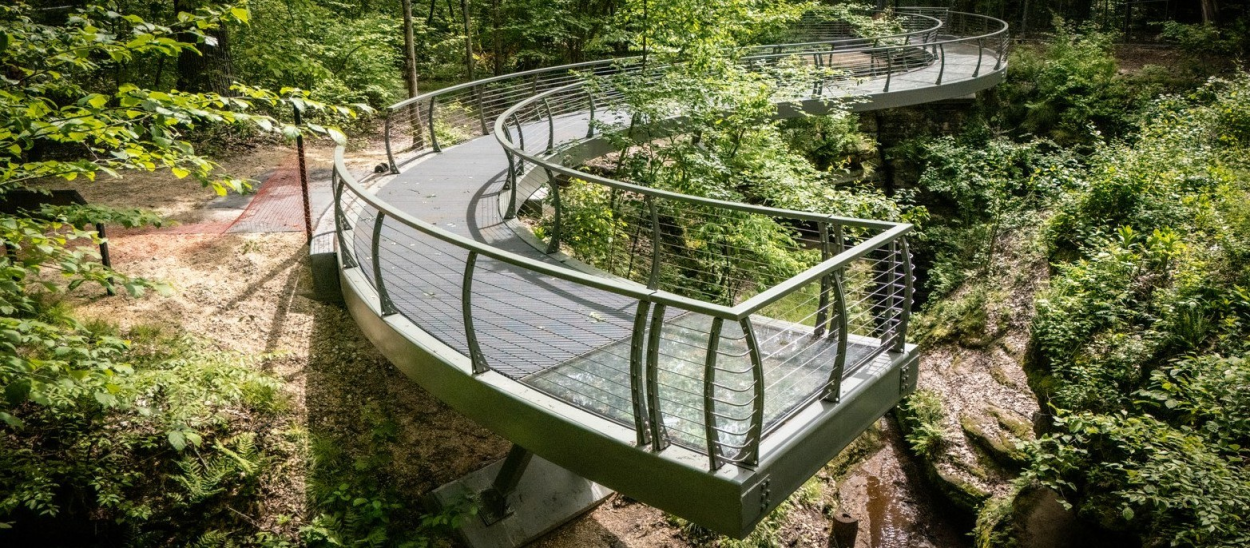 The project team collaborated with ODNR to evaluate the feasibility of the Falls Edge Glass Walkway, a new pedestrian bridge envisioned as a signature destination within the Nelson-Kennedy Ledges State Park. The concept involved a permanent, glass-deck structure spanning one of the park’s dramatic rock formations and aims to create an immersive visitor experience while honoring the site’s rugged natural character.